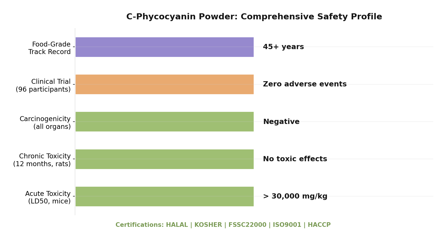 The safety profile is extensively documented. Acute toxicity testing established an LD50 exceeding 30,000 mg/kg in mice (both sexes) - indicating virtually no acute toxicity risk. A 12-month chronic toxicity study in rats (1% dietary supplementation, both sexes) found no chronic toxic effects, with carcinogenicity testing negative across all organs examined. The source material (spirulina) has undergone subacute toxicity, chronic toxicity, and next-generation testing, all confirming safety. The 96-person clinical trial reported zero adverse events in the phycocyanin group.