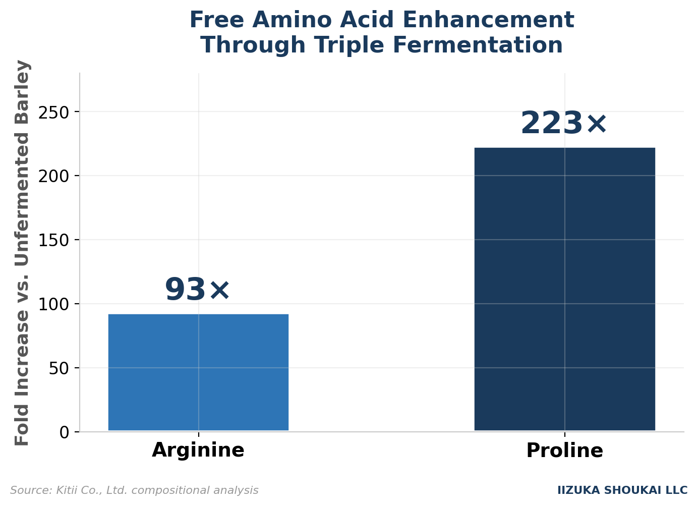 This functional ingredient is produced from barley extract through a proprietary triple-fermentation process involving Lactobacillus crispatus KT-11, yeast, and Aspergillus koji mold. Unlike single-organism fermentation common in the industry, this multi-stage process significantly increases the concentration of free amino acids — including a 93x increase in arginine and a 223x increase in proline compared to unfermented barley extract.